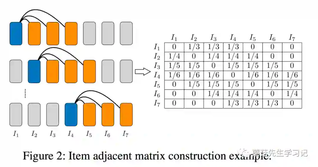 输入是短期序列 ,输出是蕴含在短期序列中用户的兴趣表征 , 是short-term的缩小。如图所示,左下角的部分。作者采用了两层的GNN网络来捕获蕴含在序列中的局部结构信息,并形成用户短期兴趣表征。为了能够用GNN来建模,需要将序列转成session graph。策略是,短期序列中的每个物品和其后面的3个物品做连接,并对形成的邻接矩阵按照行做归一化。如下图所示: