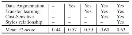 由于深度卷积神经网络在图像分类方面取得了巨大的成功[10],我们的方法也是基于这一进展。 为了应对这一挑战,我们的解决方案主要应用了以下技巧:数据增强,迁移学习和风格关系建模。总的来说,我们在测试集上取得了0.6524(F2-score),在排行榜上获得了第3名。