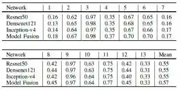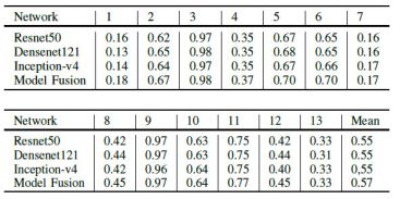我们使用几种最先进的网络架构进行了实验,例如Resnet50 [12],Densenet121 [13]和Inception v4 [14]。 在数据增强处理之后,我们单独训练这些模型。 表2列出了不同网络架构的实验结果(在验证数据集上)。 我们可以看到,Resnet50在运动和日系方面取得了更好的成绩,而Densenet121在少女,朋克和休闲方面表现更好。此外,Inception-v4的性能可以达到大多数类的中等水平。 此外,由于互补学习,模型融合可以进一步将性能提高到新的差距。