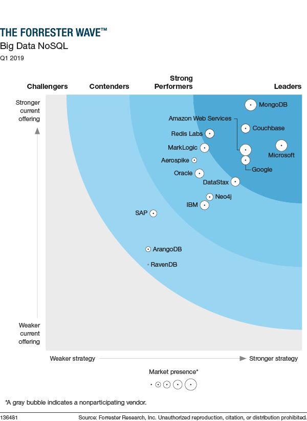 Forrester的研究揭示MongoDB、微软、Couchbase、AWS、谷歌和Redis Labs是市场的领导者,MarkLogic、DataStax、Aerospike、Oracle、Neo4j和IBM是表现优异者,而SAP、ArangoDB和RavenDB是竞争者。