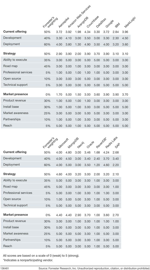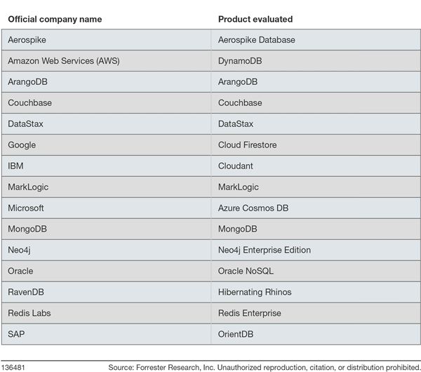 Forrester在该评估中介绍了15家供应商:Aerospike、AWS、Arango DB、Couchbase、DataStax、谷歌、IBM、MarkLogic、微软、MongoDB、Neo4j、Oracle、RavenDB、Redis Labs和SAP。