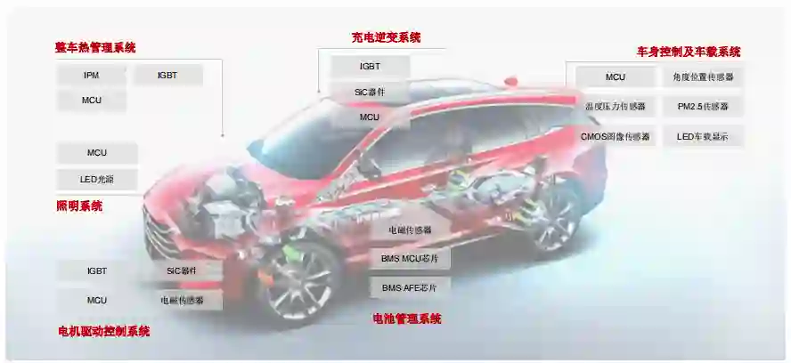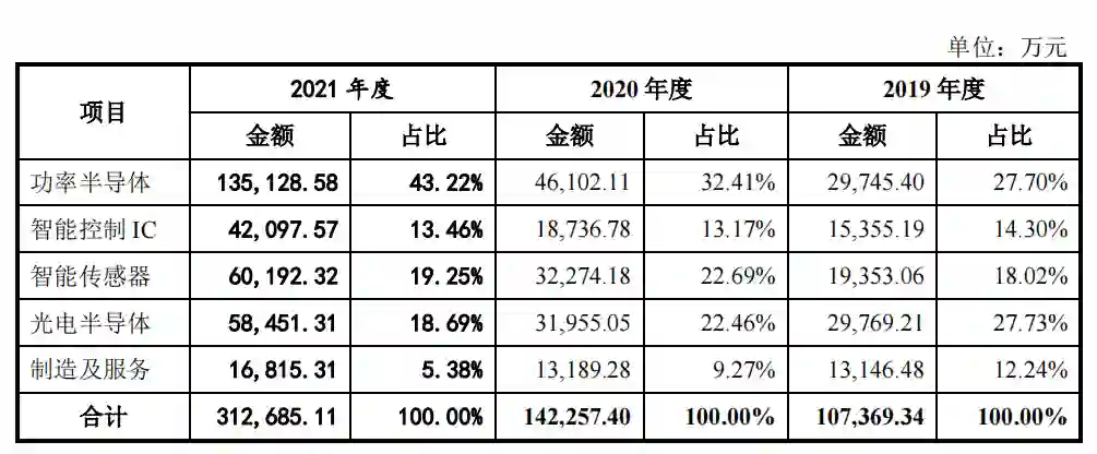 今天看,比亚迪半导体的主营业务可以分为5类,分别是功率半导体、智能控制IC、智能传感器、光电半导体和制造及服务。并非巧合,比亚迪半导体的业务线可以理解为:以车规级半导体为核心,向工业级、消费级半导体延伸,其中占比最高的功率半导体的主要组成也就是IGBT(绝缘栅双极晶体管)、次之则是智能控制IC的主要组成也就是MCU(微控制单元),而都是过去两年车企们最缺的芯片。