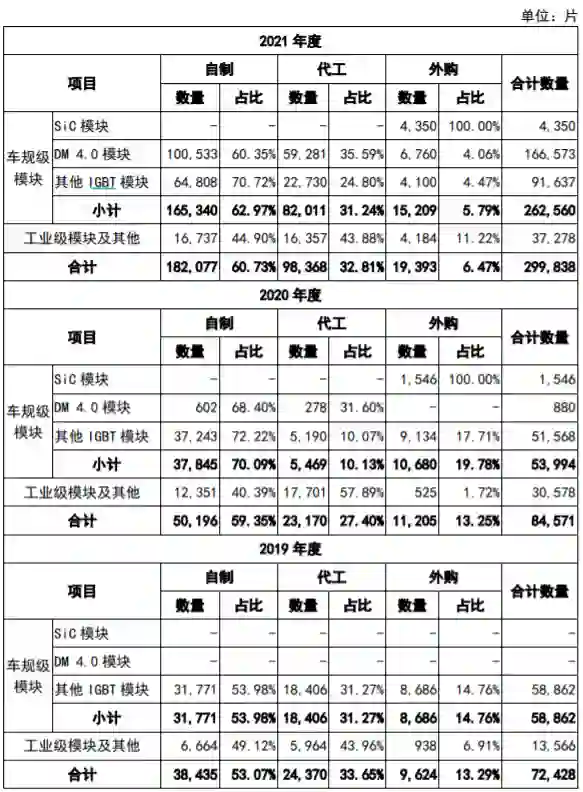 招股书也披露了这方面的数据。2021年,比亚迪半导体车规级功率半导体自给率不到63%,有30%以上仍然需要委外代工,剩下不到6%的部分需要对外采购。这不单单是个别现象,招股书数据显示,2019-2021年,比亚迪半导体有3成功率半导体需要由其他晶圆厂制造。