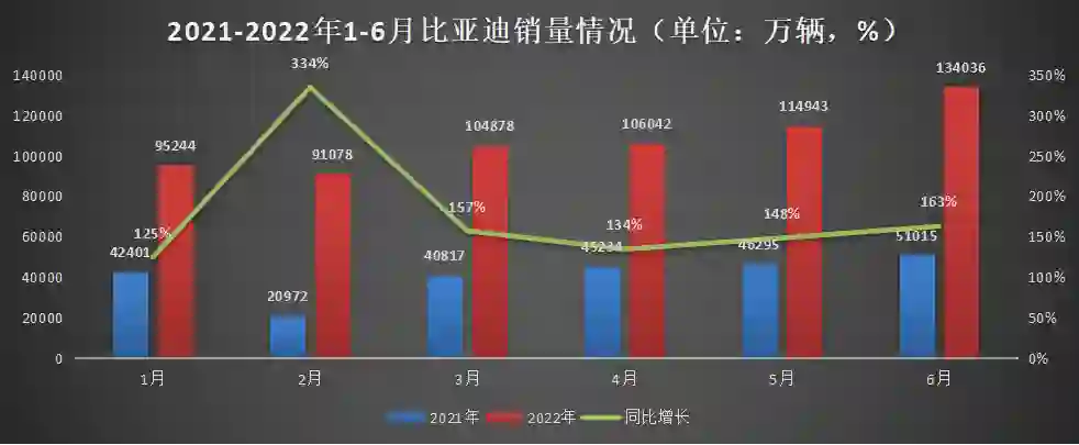 推高的过程中也仍然要在创新上有所侧重,所以飙升最快的就是新能源车。2022年上半年,新能源车销量较去年增长了1.2倍,远远超过了汽车行业整体大约20%的增速。按照6月最新的销量数据,新能源车卖了59.6万辆,这其中有13.4万辆贡献自比亚迪。也就是说,几乎每4辆新能源车就有1辆来自比亚迪。