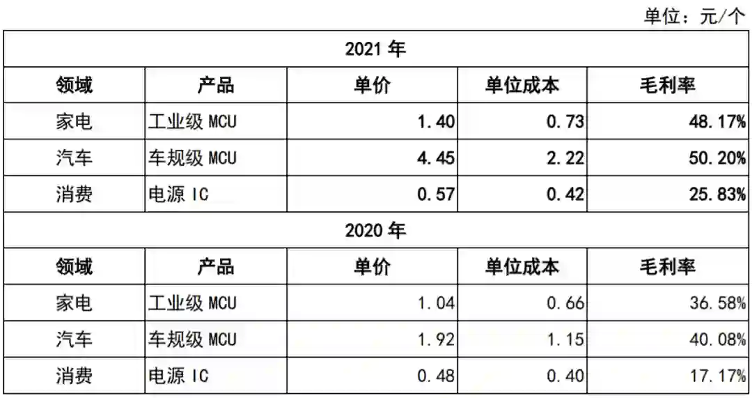 同样按照一个价格涨幅来说,去年车规级MCU单价从1.92元/个增长至4.45元/个,对应毛利率由40.08%增长至50.20%;工业级MCU单价由1.04元/个增长至1.40元/个,对应毛利率由36.58%提升至48.17%。