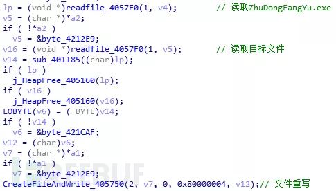重写这些文件,将自身文件写入这些文件的开头,后期如果再运行这些文件的话,就会运行ZhuDongFangYu.exe
