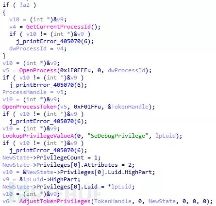 样本运行之后,首先调整进程权限,确保自己有足够的权限进行后续的操作