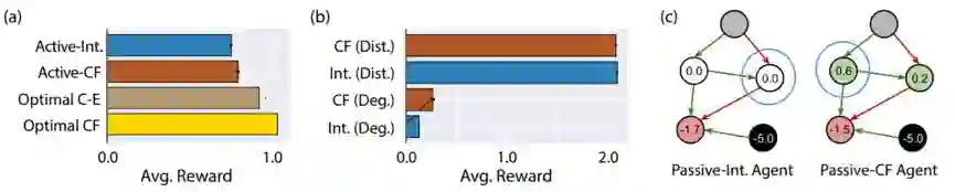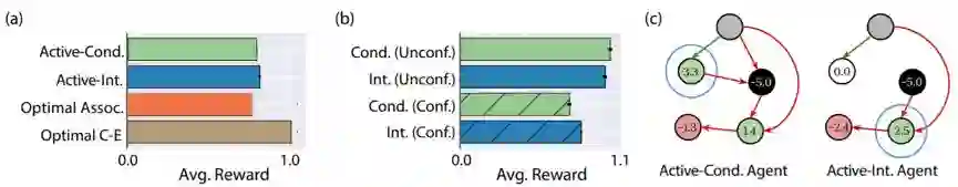 图 3:实验 2。智能体根据干预数据执行因果性推理。a)实验中测试的智能体得到的平均奖励。b)在有外部干预的节点上根据存在或不存在未被观察的混杂变量(分别表示为 Conf. 和 Unconf.)而划分的表现。c)一个测试 CBN 的测验阶段。