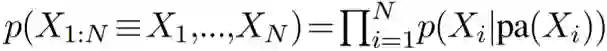 随机变量之间的因果关系可以使用因果贝叶斯网络(CBN,详见补充材料)表示。CBN 是一种有向无环图模型,既能表示独立关系,也能表示因果关系。每个节点 X_i 对应于一个随机变量,并且联合分布 p(X_1,...,X_N) 是根据每个节点 X_i 的父节点 pa(X_i) 通过求每个节点 X_i 的条件分布的积而得到的,即: