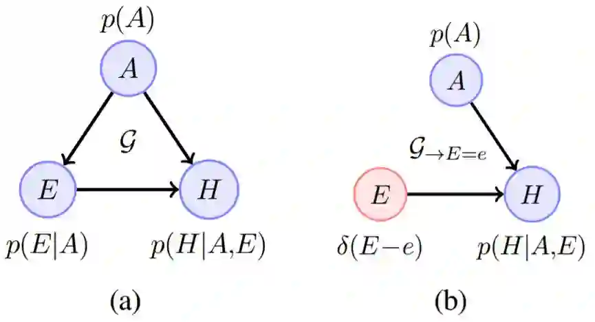 图 1:(a)有一个混杂变量的因果贝叶斯网络(CBN):年龄(A)和锻炼身体(E)对健康(H)的影响。(b)受干预 CBN,通过将 p(E|A) 替换成一个 δ 分布 δ(E−e) 而对前面的 CBN 进行了修改,条件分布 p(H|E,A) 和 p(A) 保持不变。