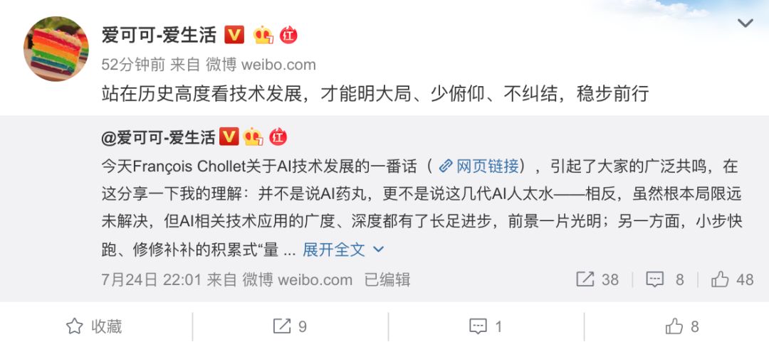 知名互联网资讯博主 @ 爱可可 - 爱生活也对此给出了自己的解读,他认为 Francois Chollet 的这番话并不是说 AI 药丸,更不是说这几代 AI 人太水。