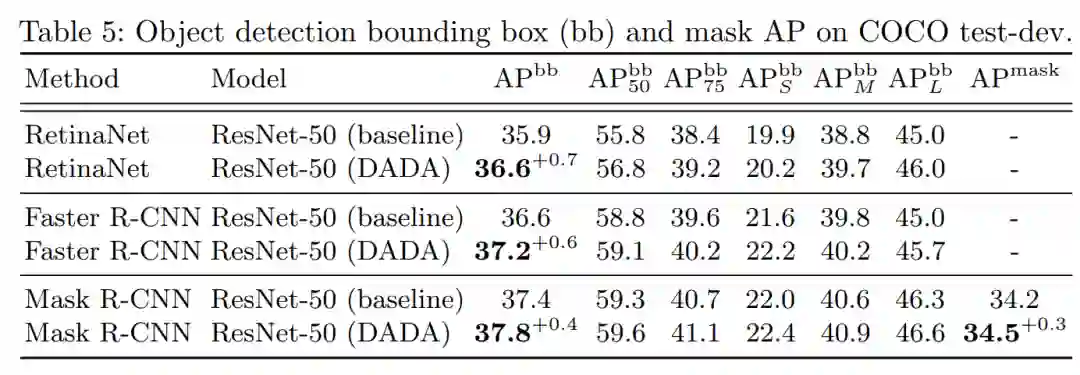 除此之外,我们也将数据增广训练的ImageNet模型作为目标检测的预训练模型,也提升了RetinaNet、Faster R-CNN和Mask R-CNN的性能。后续工作将尝试直接将我们的算法直接应用到目标检测任务上。