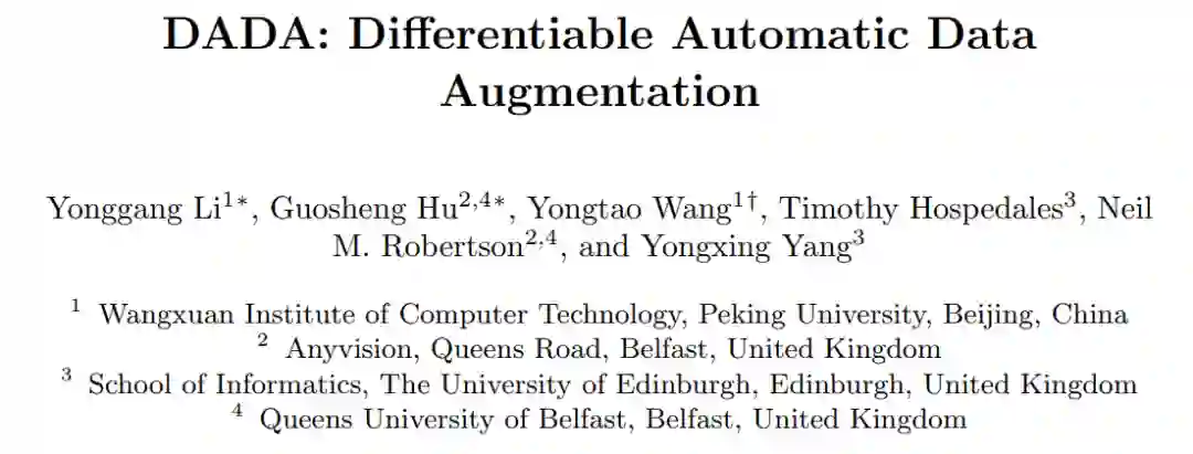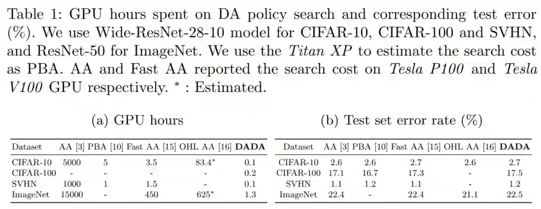 我们被ECCV 2020接收的工作 DADA: Differentiable Automatic Data Augmentation 使用可微分算法进行数据增广策略搜索任务。该方法大大提升了搜索效率,相较于以往经典的AutoAugment算法,我们的搜索代价从5000 GPU Hours缩减到了0.1 GPU Hours,并且该方法的准确率还保持和以往方法相当。