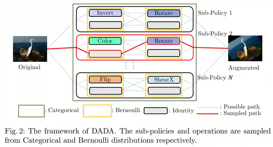 1. 我们首先将数据增广策略搜索形式化为对105个sub-policies的categorical-distribution采样问题,对sub-policies里每个操作的概率作为bernoulli-distribution采样问题。