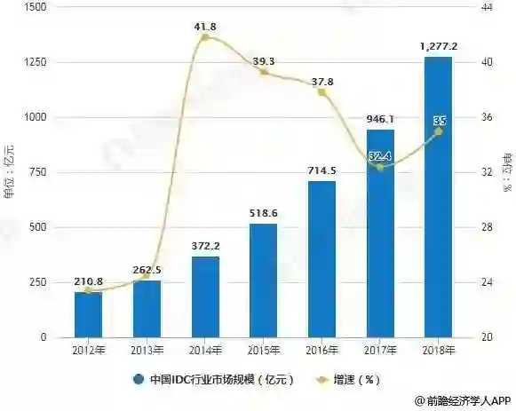 作为互联网的基础设施,数据中心产业也随着互联网行业的发展而发展。2011年中国IDC行业市场规模已达2010.8亿元。2015年市场规模突破500亿元, 2017年市场规模增长至946.1亿元,截止至2018年中国IDC市场继续保持高速增长,市场总规模为1277.2亿元人民币。据预测,2020年中国数据中心行业市场规模将超过2000亿元人民币。