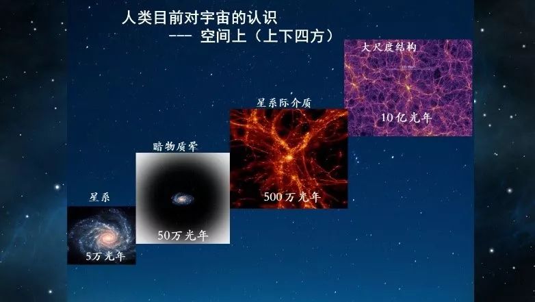 大家可能听说过清华大学在 2400 米的地下有一个锦屏山地下实验室。为什么在 2000 多米的地下可能探测到暗物质呢?因为在那里所有可见物质,不管能量多高,都已经被挡住了。如果能观测到那里的粒子,那应该就是不和正常物质有电磁相互作用的暗物质。目前锦屏山还没有发现任何痕迹,但暗物质是客观存在的,已经有科学家通过星系的旋转曲线等多种独立的天文方法推测出来了。星系就是被暗物质凝聚在一起,整个暗物质晕又呈纤维网状排布。这是空间上我们研究的一个尺度。