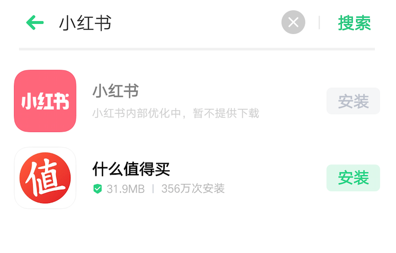 7月29日,报道称,除小米商城和IOS系统的Apple store外,包括华为、OPPO、魅族、一加等在内的安卓应用商店均无法下载小红书app。今天上午,创业邦在手机软件商店搜索小红书App,提示显示:“该应用内部优化中,暂不提供下载”。