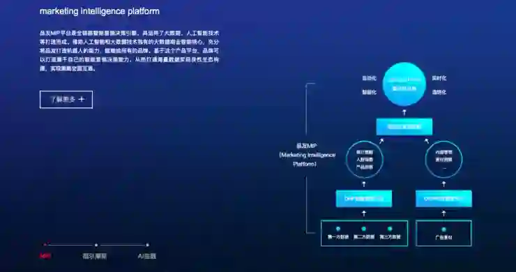 2017年上线的MIP(Marketing Intelligence Platform)平台,有效整合了DMP数据管理平台、CMP内容管理平台和PDB智能投放管理系统三大模块。智能策略引擎DMP整合媒体价值洞察、人群深刻洞察、科学归因模型,智能内容引擎CMP包括创意内容云端管理、产品改建创意测试、自动创意物料调优。导出智能化营销策略,对接到智能投放管理系统(程序化广告投放、常规广告投放管理、社交广告管理、电商投放管理)。最后,智能投放管理系统再反哺于DMP、CMP。其中,擎天柱系统Optimus Prime具备自动化、实时化、智能化、透明化四个特点。