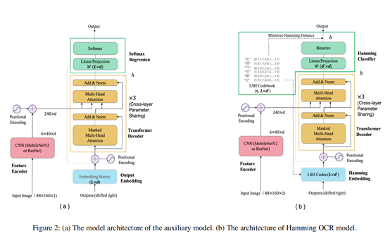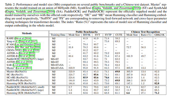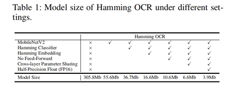 场景文本识别中很多模型都使用了笨重的模型,这些模型很难在移动端设备上部署。这也是最近大火的Paddle OCR使用CRNN实现其超轻量级识别模型的原因。PaddleOCR采用的策略就是暴力削减特征通道来减小模型,但是这样使得性能大幅度下降。最近在arXiv上公开的Hamming OCR提出了Hamming Embedding和LSH局部敏感哈希分类的算法,大幅度削减模型大小,同时保留模型能力。