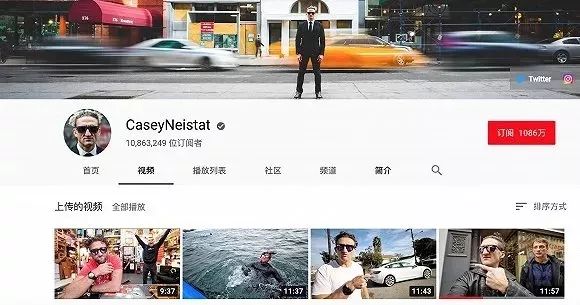 Casey Neistat是受益于YouTube的第一批网红Vlogger,目前有1086万订阅用户。这位草根起家的博主擅长创意和不走寻常路,有人将Casey的风格形容为Organized Chaos(有组织的混乱)。他的代表作是“价值$21000的飞机头等座”,这则两年前的视频让他收获6098万播放和83万点赞。