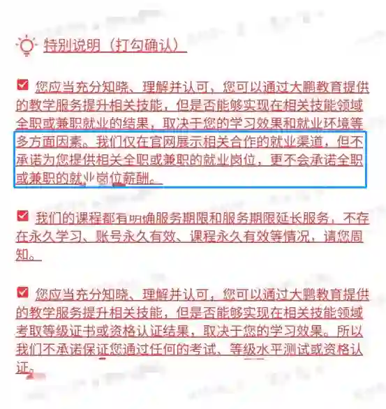 根据张悦发来的协议条款截图,锌刻度看到确实有这样一则被标红的特别说明,“我们仅在官网展示相关合作的就业渠道,但不承诺为您提供相关全职或兼职的就业岗位,更不会承诺全职或兼职的就业岗位薪酬。”