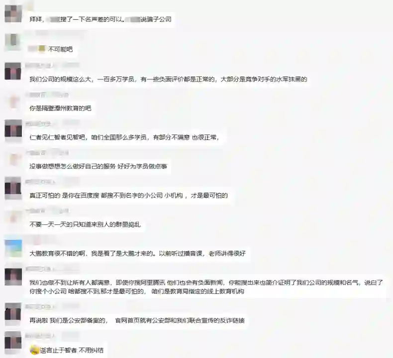不过值得留意的是,和锌刻度同期的某位学员,曾因XX教育在网络上的诸多负面消息在开班福利群中提出过质疑,“搜了一下名声差得可以,都说是骗子公司”,但随后就被群里的老师以“你是隔壁XX教育的吧”反怼了回去。