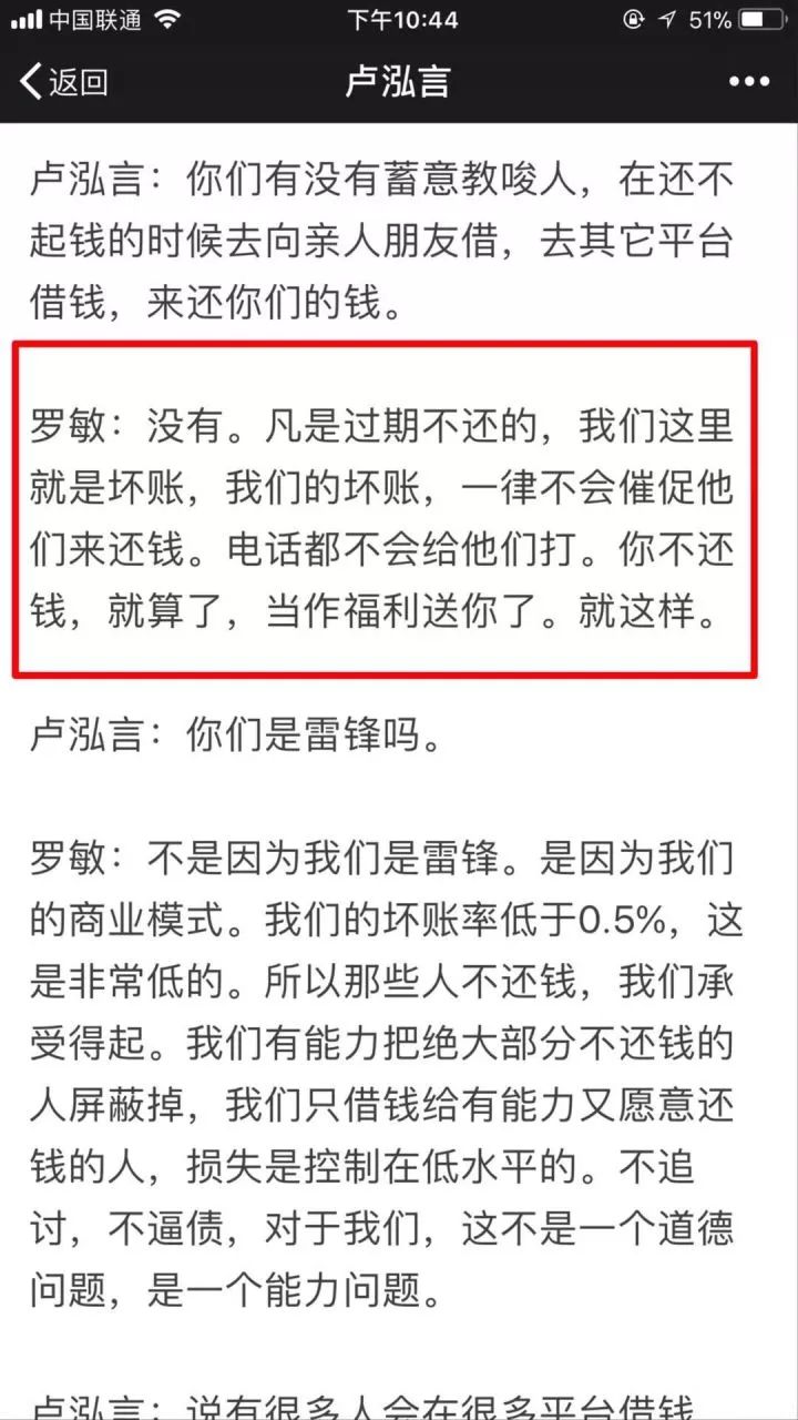 罗敏说,凡是在趣店逾期不还的贷款,直接作为坏账处理,不会进行追讨,直接送了。