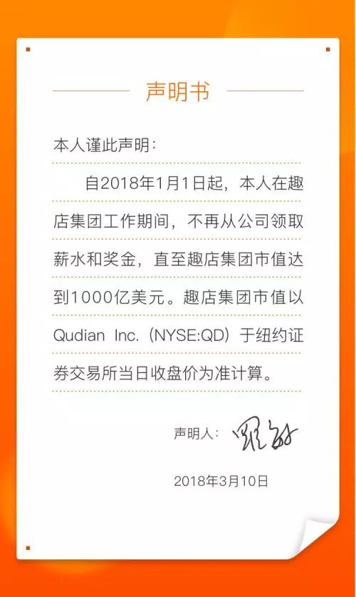 自2018年1月1日起,本人在趣店工作期间,不再从公司领取薪水和奖金,直到趣店集团市值达到1000亿美元。