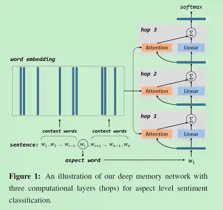 Aspect Level Sentiment Classification with Deep Memory Network(Tang/EMNLP2016): https://arxiv.org/abs/1605.08900