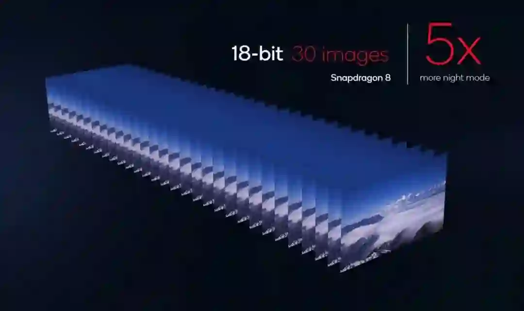 骁龙 8 Gen 1 的 ISP 从上代的三通道 14 位升级至三通道 18 位,可处理的数据量提升至 4096 倍,每秒可捕捉 32 亿像素,并支持同时处理三个 3600 万像素摄像头视频流。它还支持通过一次拍摄 30 张照片(上代为 6 张)进行合成,提升夜拍质量。