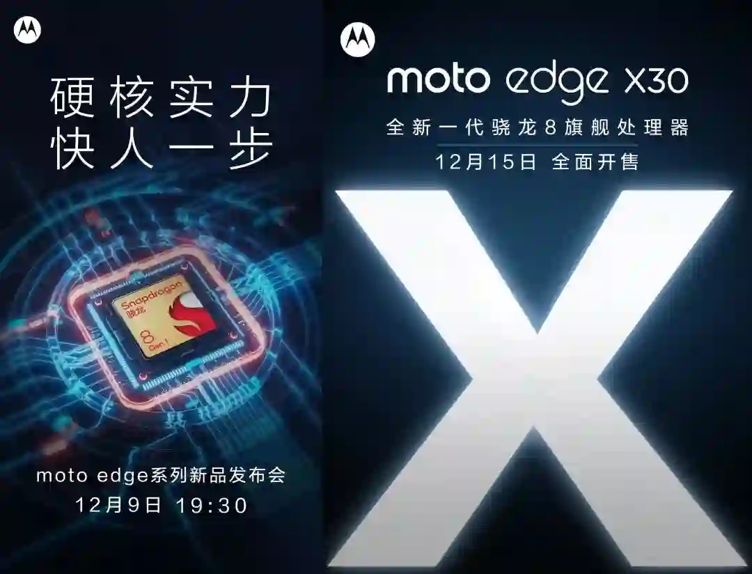 没错,抢小米首发的联想又来了。今日,联想旗下摩托罗拉官宣将于 12 月 9 日发布moto edge X30/Pro 系列新品,提供骁龙 8 Gen 1 以及骁龙 888,12 月 15 日全面开售。