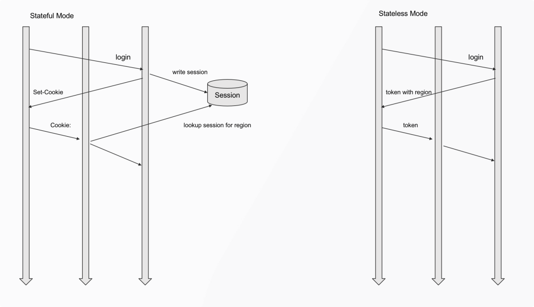 有状态模式一般会利用 Session(如上图左侧),客户端登录完成后 Sever 会将附带 Session ID 的 Cookie 给到客户端。在请求时,基于 Apache APISIX 实现的网关层会使用 Cookie 中的信息查询用户所处的地区。即便用户更换了服务器,依然可以保持登录状态,系统也可以判定从哪里获取数据。
