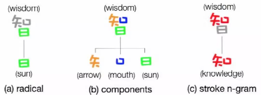 通过观察中文字符内部组成,发现中文字符包含偏旁部首、字符组件,笔画信息等语义信息特征(如下图),基于偏旁部首和汉字组件特征的中文词向量模型已经有人提出,并取得了较好的效果。