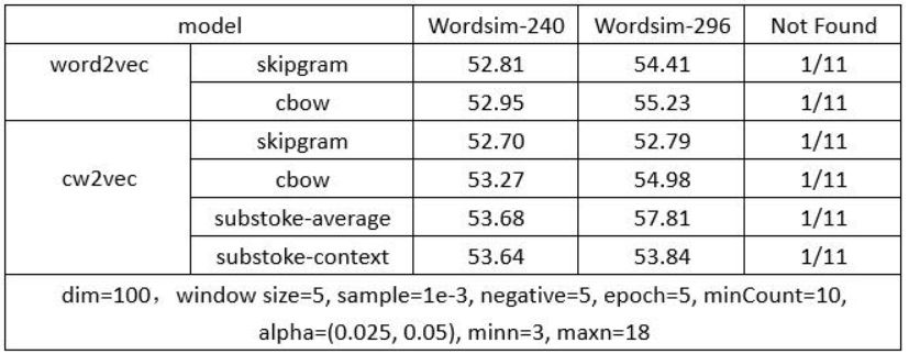 cw2vec论文提出采用context word embedding 作为最终的词向量,在这份代码中,不仅仅考虑了context word embedding ,而且,根据fasttext提供的思路,把笔画信息的n-gram特征取平均作为最后的词向量,所以,substoke模型会输出两份词向量,vec代表context word embedding,avg代表笔画信息的n-gram特征取平均。