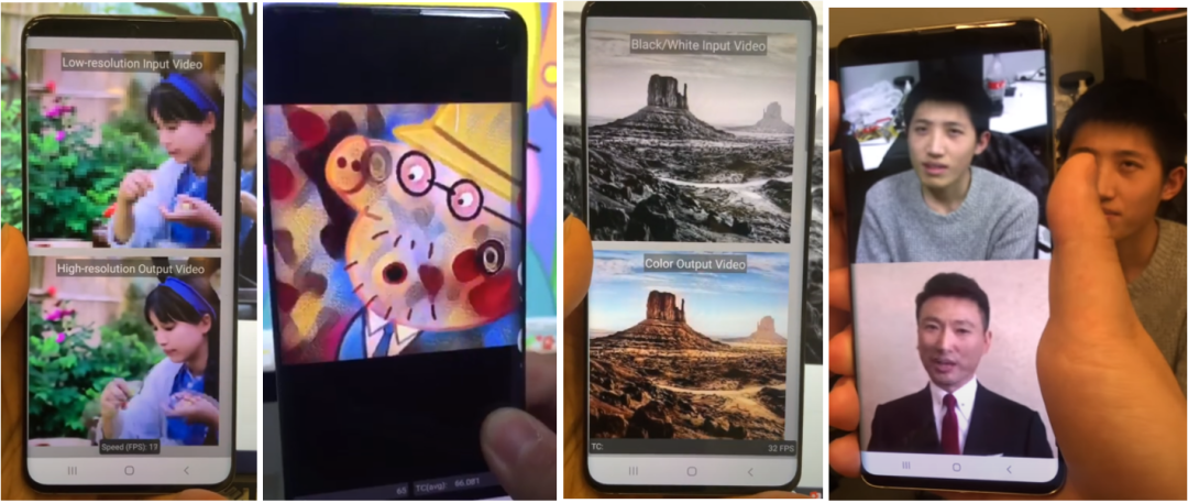 图9.基于模式化剪枝与通用型移动端推理框架在手机端不同AI应用场景的执行效果示意。从左到右依次为:相机超分辨率拍摄、实时相机风格迁移、视频实时上色、AI换脸。