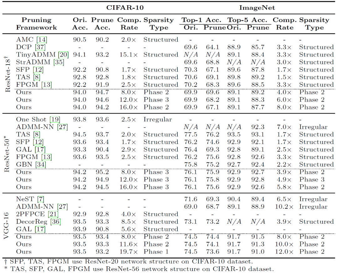 表 1. 基于模式化的剪枝在 CIFAR-10 与 ImageNet 数据集上的剪枝结果对比。