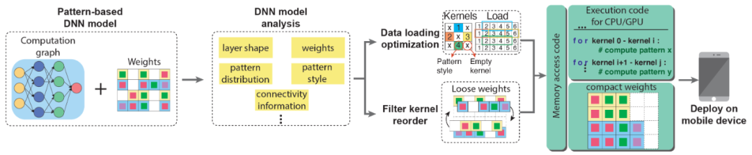 通过上述模式化稀疏度感知训练框架,我们得到了模式化剪枝后的稀疏模型。如何利用模型的权重空间分布特点实现编译器优化成为移动端硬件与编译器优化层面的研究重点。