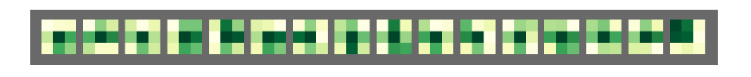 图 1. ImageNet 数据集上 VGG-16 第三卷积层中随机选择的卷积核的热力图。每个内核中的权重值都经过归一化处理,深色表示该处为较高的绝对值。