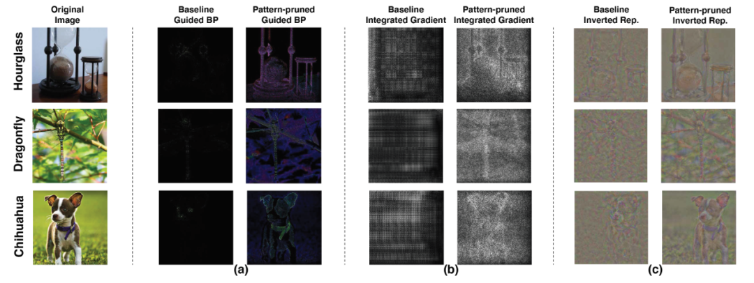 图 6. 基于 VGG-16 在 ImageNet 上剪枝后的模型可视化效果图。此处采用了三种不同的可视化方法:(a)guided-backpropagation (BP) ,(b) integrated gradients,(c)inverted representation。