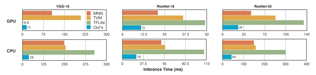 我们同时可以观察到,卷积核与输出通道重排后的模型权重分布非常规则与紧凑,因此,在缓存与寄存器访问频率上的优化效果变得非常明显。规则与紧凑的数据意味着更低的数据访问频率,而数据访问频率降低意味着更低的内存开销。这一设计方法是可通用的,因此该研究提出的移动端推理框架可以大规模地部署在现有各种量产手机端,实现端上 AI 实时推理,满足用户需求。