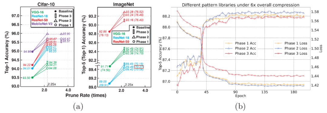 图 7. (a)基于 CIFAR-10 与 ImageNet 的不同深度神经网络在模式化剪枝下的精度升高实验结果,(b)卷积核模式化剪枝叠加连通性剪枝后的 ResNet-18 训练曲线图。