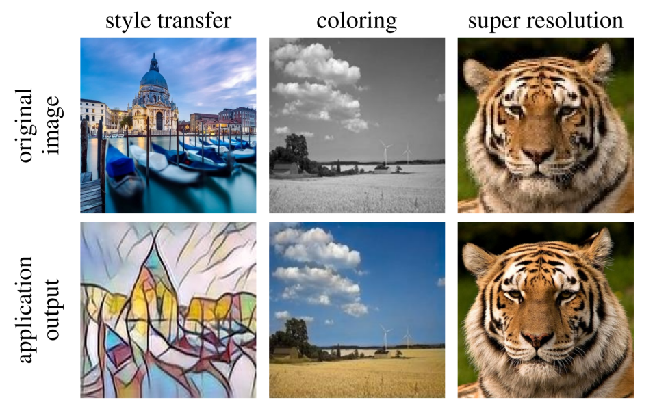 图10.基于模式化剪枝与通用型移动端推理框架在手机端的执行效果图。从左到右依次为,实时相机风格迁移、视频实时上色、相机超分辨率拍摄。