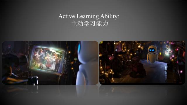 无人系统要具备自主学习能力,与世界的每一次交互,都能够自主记录、自主训练、并从中学习。智能体要从原始输入中自主学习,从环境中回馈信号。从而自主完成它与环境的每一次交互。而在无人系统中,让机器通过探索周围的环境自主学习要执行什么任务,可以实现更多智能化创造性的任务。这样我们才可能会培养出像大白那样出得厅堂、下得厨房、打得怪兽、上得战场的智能机器人。图中展示了Eva与瓦力看到电视里的舞蹈,随之翩翩起舞的过程,这展现的就是自主学习能力。