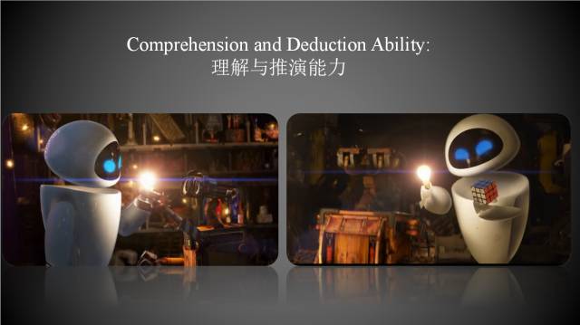 此外,无人系统还要具备理解与推演能力。左图是Eva与瓦力的初见,瓦力用一个灯泡来讨好Eva向Eva示好的过程,而右图则是瓦力打怪受伤后,Eva用同一个灯泡献宝地讨好瓦力的过程。这展现的是Eva对瓦力行为的理解、以及对其喜好的推演的能力。