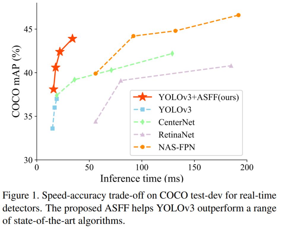注:YOLOv3+ASFF(自适应空间特征融合)组合,性能优于CornerNet和CenterNet等,在COCO上,38.1mAP/60 FPS,43.9mAP/29FPS!