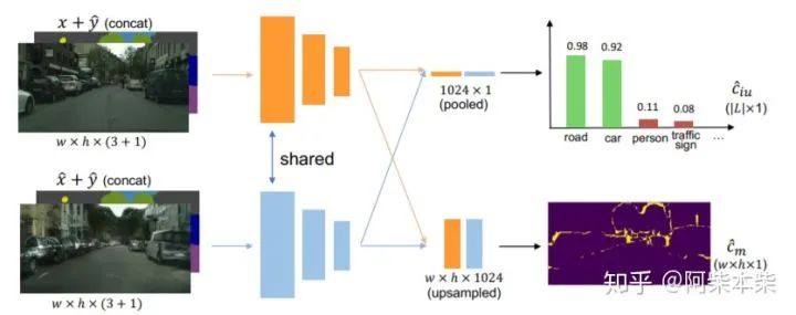 在故障检测中,C^代表的是C^iu与C^m的集合。C^iu和C^m就是前面在简介中所提到的预测的分割结果与“真值”的在当前图像上存在的类别的交并比与定位到预测错误区域的error map。他们的形状分别为长为L的一维向量与宽高分别为w,h(即原图宽高)二维map。