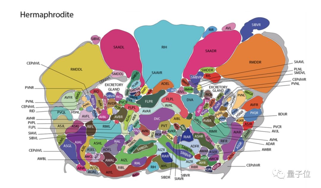 这108个神经元可以分成三组,包括支配前半身运动的头部神经元、支配其他肌肉的腹侧脊髓运动神经元,以及亚侧运动神经元。