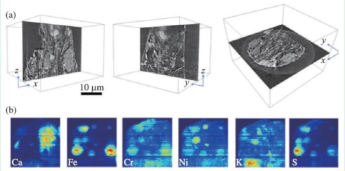 图13 油页岩样品的跨装置关联成像结果(a)利用位于美国加州SLAC国家加速器实验室的X射线全场显微成像技术获得油页岩样品的三维结构信息;(b)利用位于美国长岛布鲁克海文国家实验室的X射线纳米探针技术获得的同一油页岩样品的二维元素分布信息