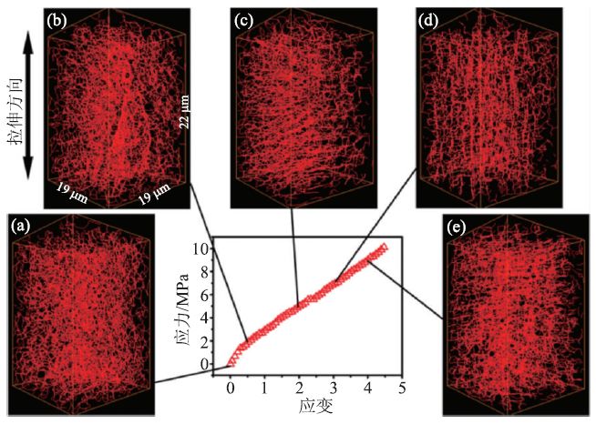 有机硅聚合物—二氧化硅纳米填料体系纳米相衬成像结果显示,纳米二氧化硅填料形成了三维连接的网络结构,这个三维网络结构与有机硅链形成二重的网络结构,探索了纳米二氧化硅填料可以大大增强有机硅橡胶机械性能的机制。不同应变条件下的成像结果显示,虽然在大的应变条件下二氧化硅填料的网络发生了很大的变化,但是二氧化硅填料的连通性并没有明显的变化。图11 是利用纳米相衬三维成像数据进行图像分割渲染后获得的不同应变条件下有机硅聚合物—二氧化硅纳米填料体系中填料网络结构的演变情况。其中, 图11(a—e) 对应的应变分别为0、0.5、2.0、3.0和4.0。