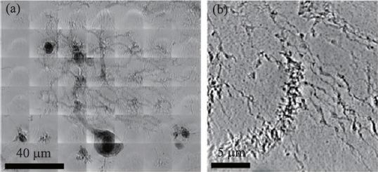 图10 (a)神经元的纳米分辨显微成像结果(下部包含了一个浦肯野细胞)和(b)局部放大结果可以看到神经元树突结构(引自参考文献[34])